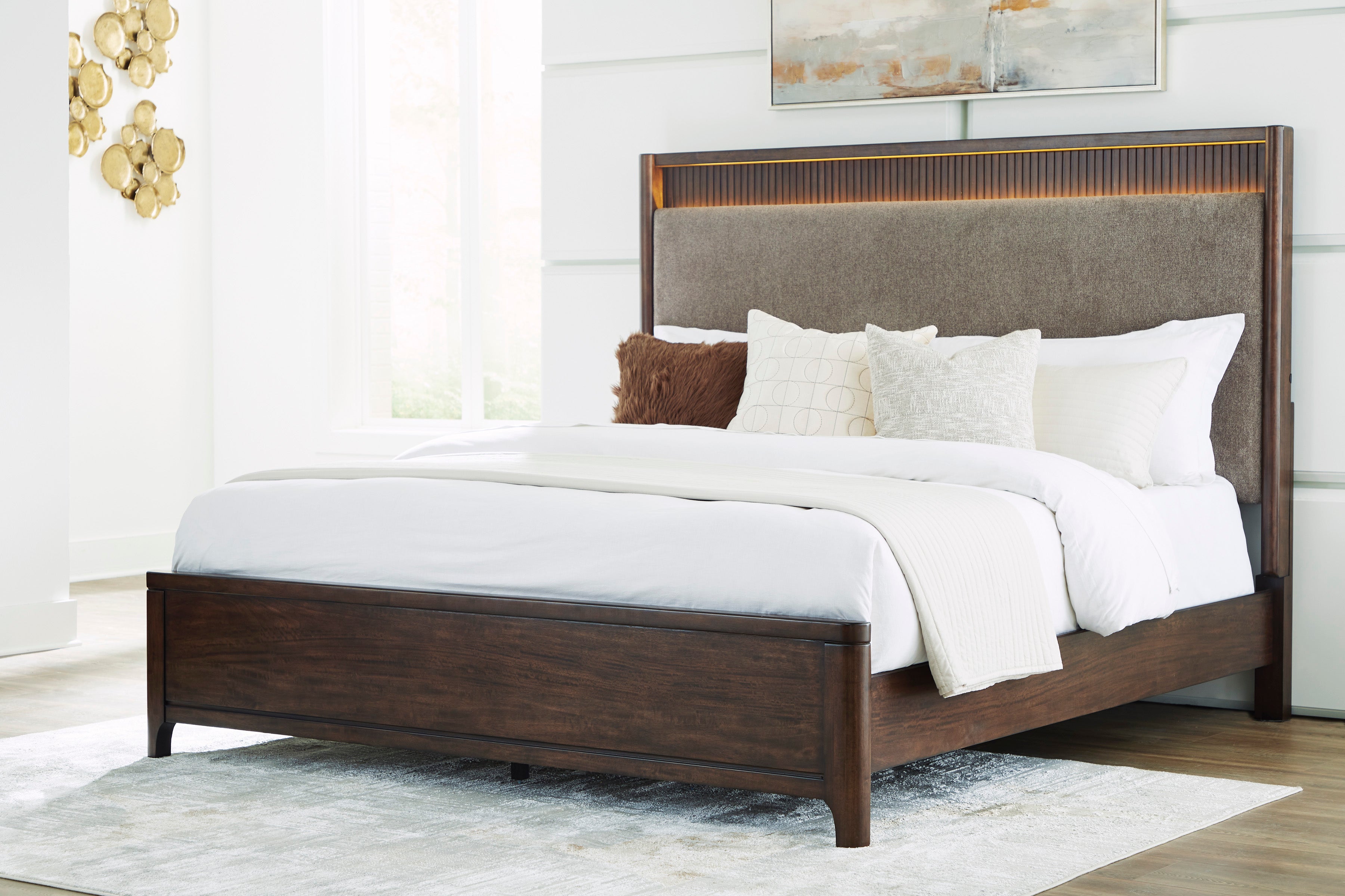 The Korestone bed embodies contemporary, everyday design with an urban touch. The warm and inviting dark brown shade and subtle beige upholstery create a cozy atmosphere, while the built-in LED lighting in the headboard makes your relaxation time even more comfortable. The vertical relief design of the headboard is a subtle reference to mid-century modern style. A perfect reflection of your simple and elegant aesthetic.