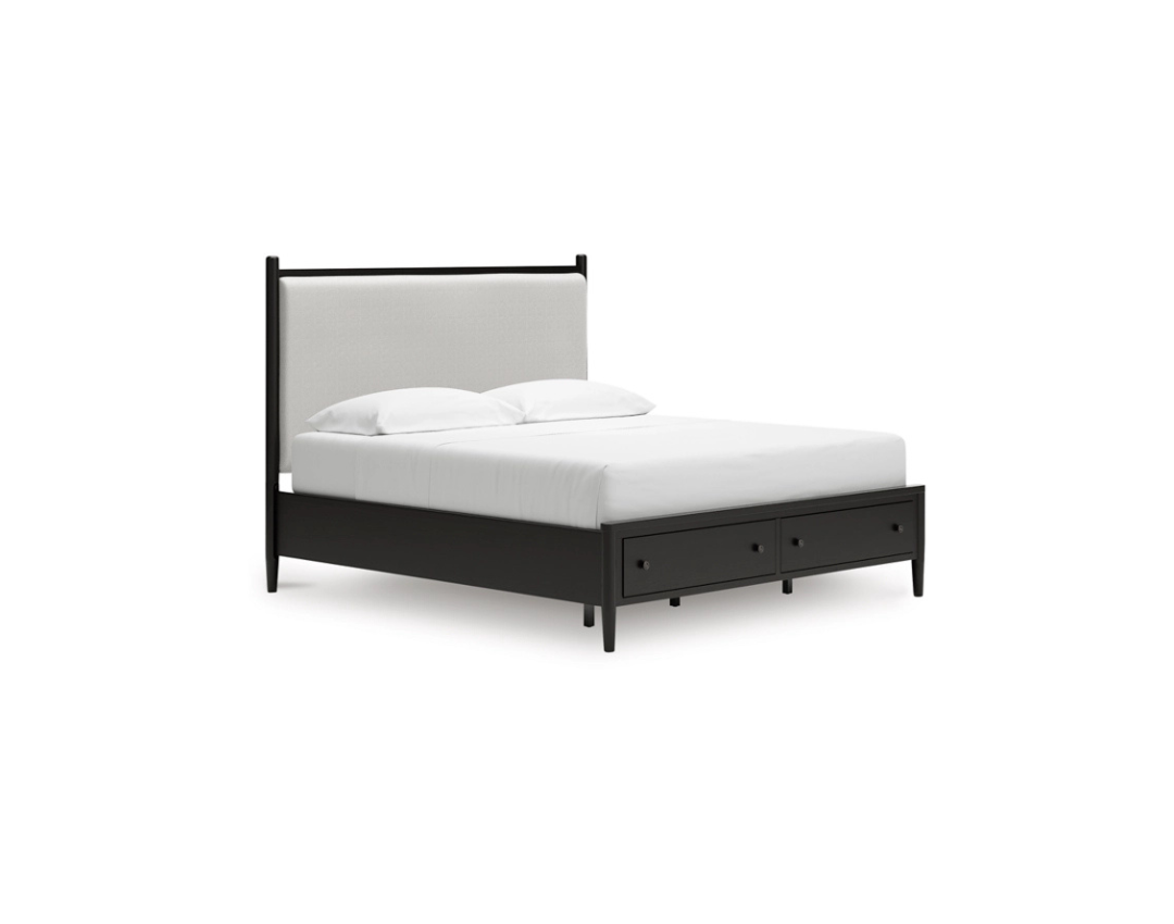 A harmonious blend of farmhouse and modern design. The Portdown bed combines crisp lines and rounded pillars for a fresh and modern look. The upholstered headboard is upholstered in Next-Gen Nuvella™, a premium fabric that is easy to clean. The contemporary French black finish with warm brown undertones perfectly complements this comfortable and inviting bed.