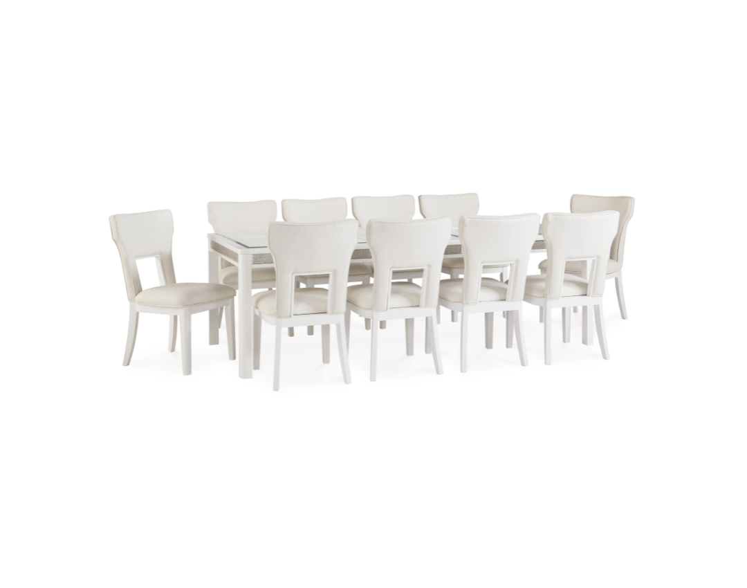 With a touch of modern luxury, the Chalanna extendable dining table set is a stunning addition to your dining room. The glossy white lacquered surface, shimmering stone accents, and clear glass panels add a touch of elegance to the table. Plus, the retractable center leaf comfortably seats up to ten guests.
